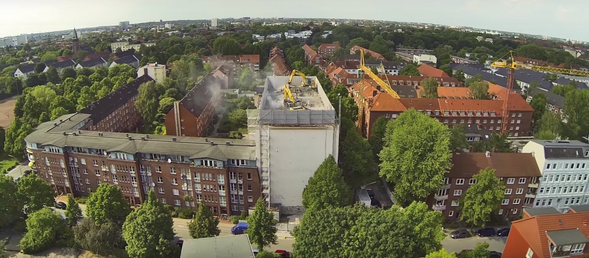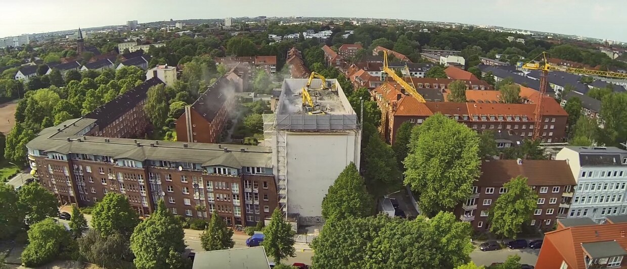The 42m long, 17.5m deep and 22m high huge bunker on the Wielandstraße in Eilbek was used as a civil defence facility at the time. 30 high-quality condominiums have now been built there, whereby parts of the bunker have been preserved. The AVG Nord removed approx.18,500t of 30,000 t of reinforced concrete and slimmed the remaining walls down to 1.10m. No blasting was used, a 32-ton excavator hollowed out the interior of the building. Since the bunker is located in the middle of residential buildings, a concept for noise protection was required.