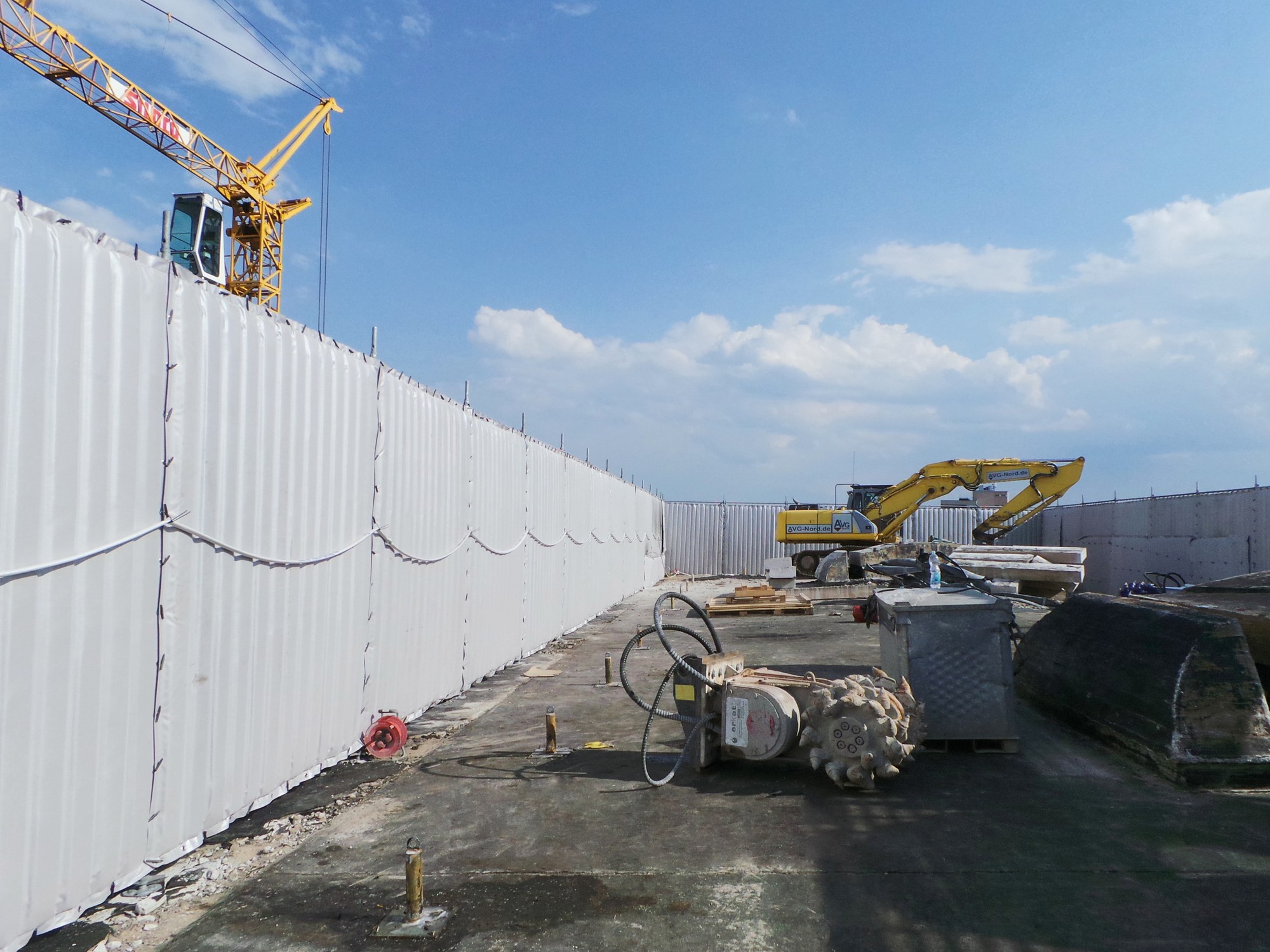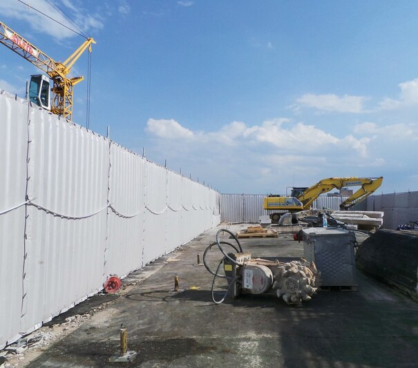 A 32-ton excavator worked its way down from the top of the bunker towards the bottom plate. In order to ensure that the noise levels were below the legal limits, Samiez Cisilent Type E was attached to the scaffolding they erected on the top of the bunker. During the demolition work, regular sound level measurements were carried out. Thanks to the protective measures taken, the permitted levels could be maintained to such an extent that the criteria of the AVV - Construction Noise Ordinance were met even for a demolition period of 8 hours a day, leaving room for contingencies.