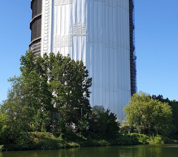 A surface scaffolding was built around the 24-cornered ground plan at full height. The inner scaffolding is accessible for work. An external scaffolding provides the necessary stability and is shielded by a canvas to function a visual and noise covers. Cisilent Type E is used between the inner and outer scaffolding to ensure the protection of the residents despite the noisy work on the steel structure. Approx. 1000 m² of Cisilent Type E are moved along the scaffolding as the work progresses. This is made possible by the low weight per unit area of approx. 5.5 kg/m² and the construction site compatible fastening technology using straps. In this way, sound insulation and economical working on the construction site can be effectively combined.