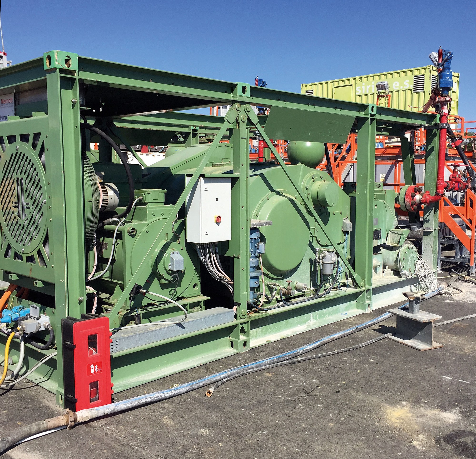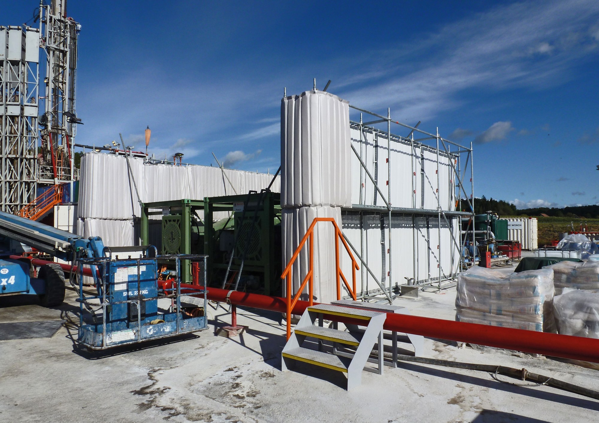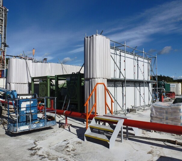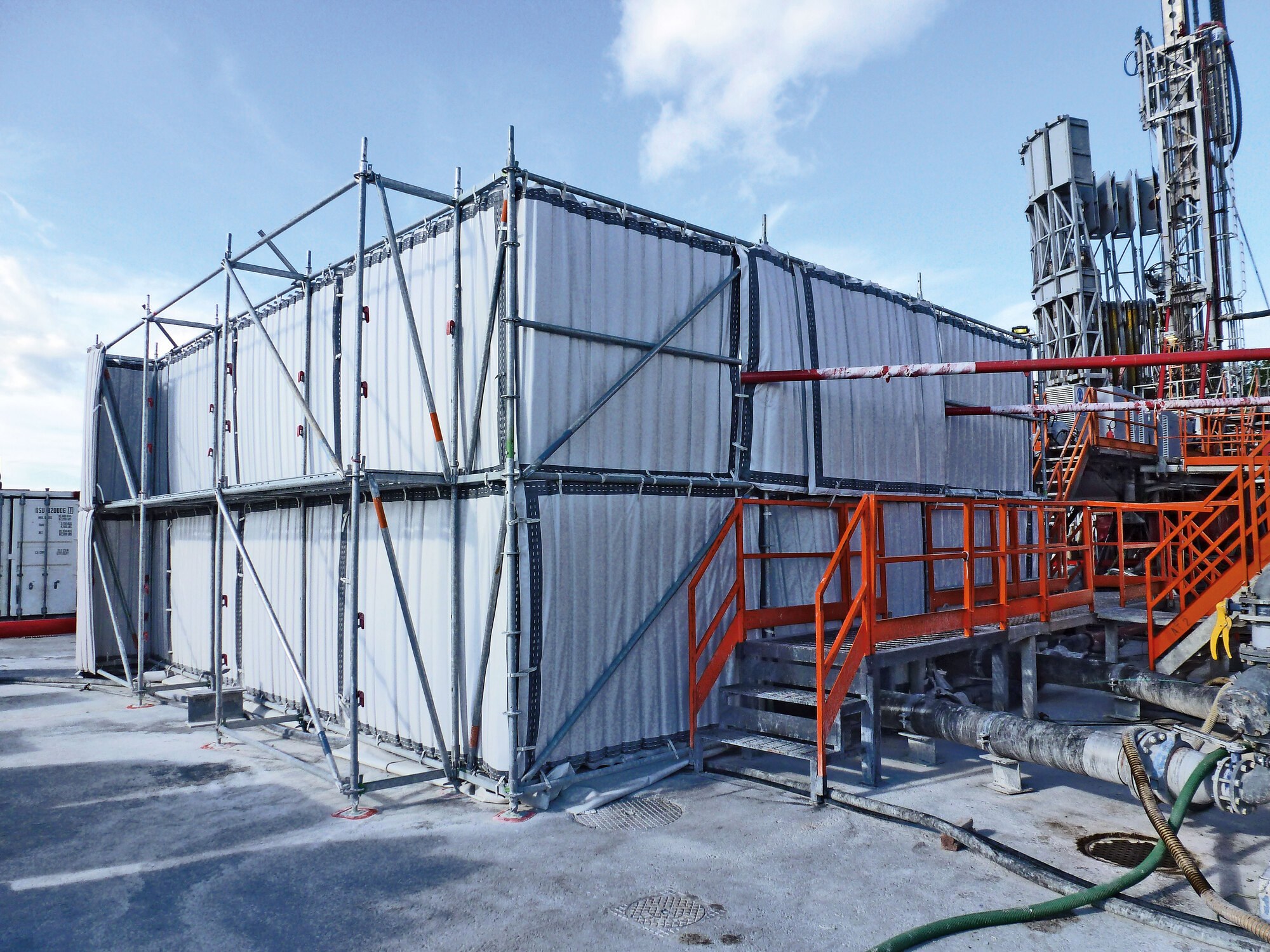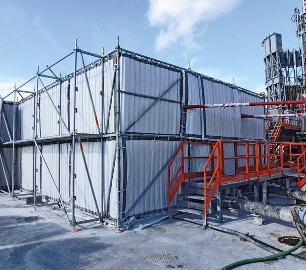 A U-shaped scaffolding was erected around the two triplex pump containers. This was necessary so that the light and flexible Cisilent Type E noise protection elements could be fixed by means of straps to the scaffolding. The enormous absorption capacity of the soundabsorbing side of Cisilent was facing the pumps. This prevented reflection going over the shielding and reduced noise pollution for the workers working on the pumps. The subsequent measurements carried out by the authorities showed that the required noise reduction was also met as a result. Our partner Schubarth advised and supervised the project and used Cisilent Type E as a rental system for sound and noise reduction.