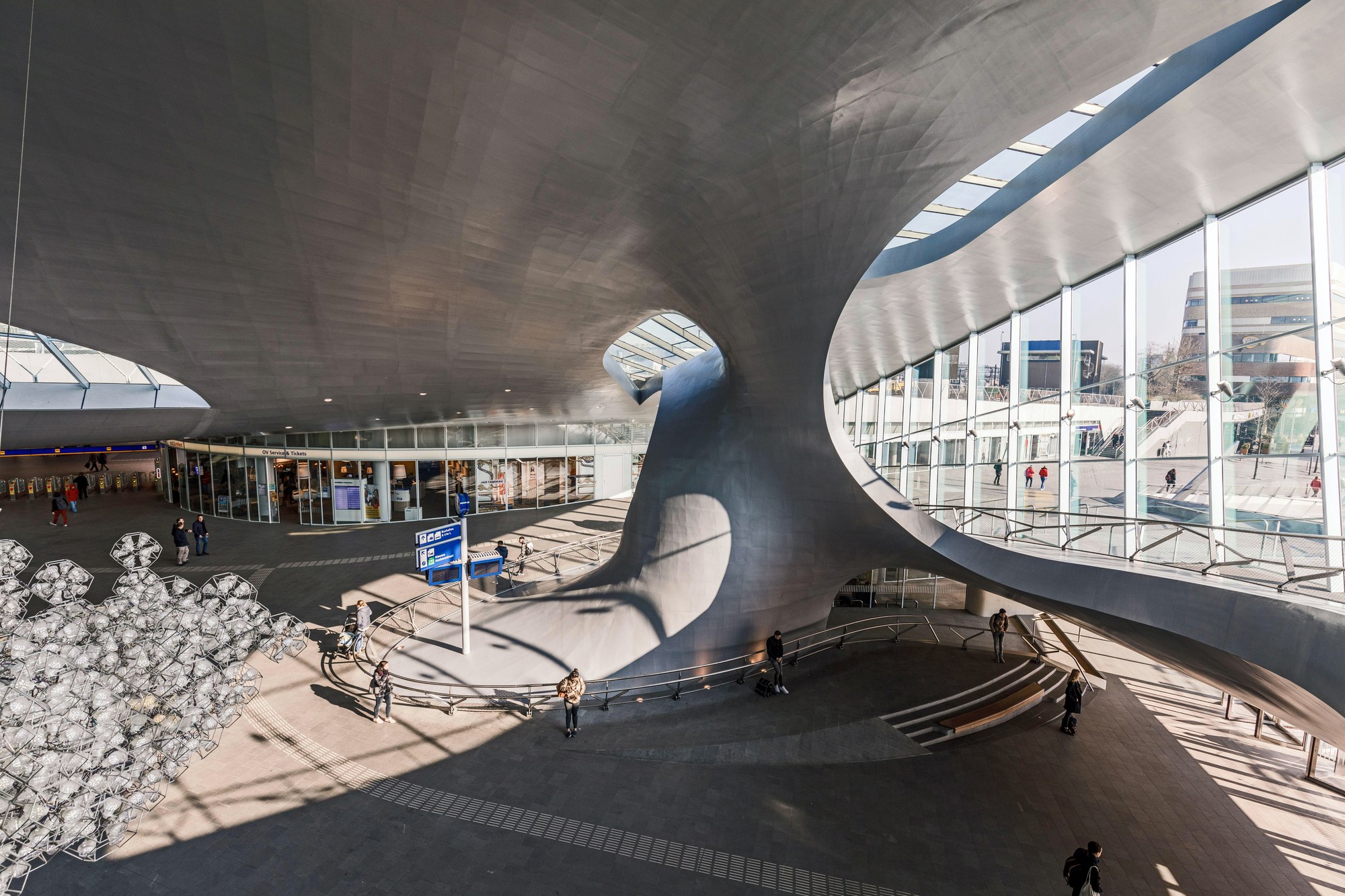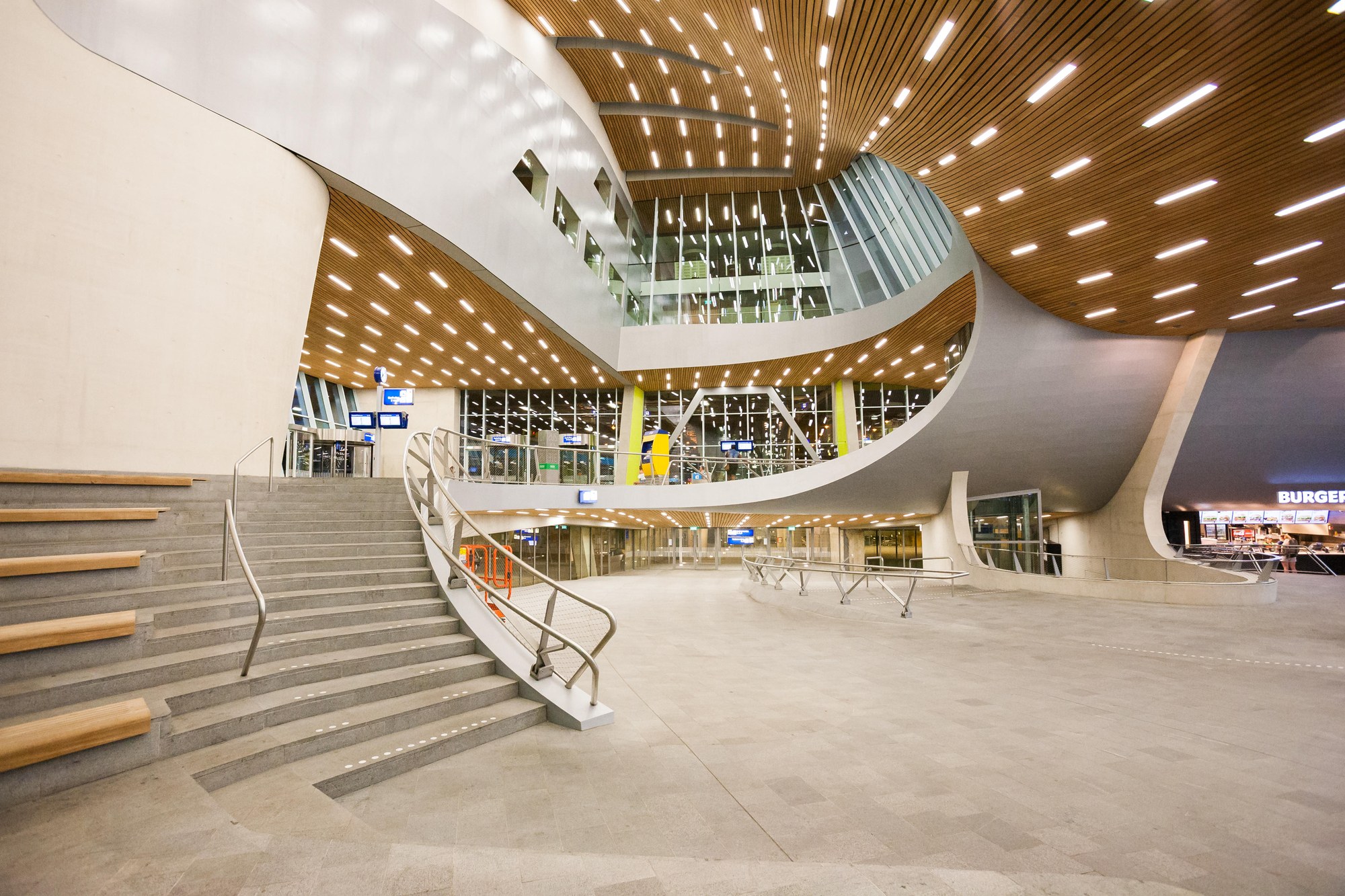 The new station building is the largest construction project in Arnhem and its 5,355 m² transfer hall offers ample space for incoming passenger flows. The curved, dynamic shape of the hall roof has column-free spans of up to 60 m. The roof, which consists of a load-bearing reinforced concrete structure, sits on top of a glass façade. The overall construction itself is a mix of steel and concrete construction. The building is rounded off by large glass façades of up to 6 m in height and 25 m in length as a self-supporting steel structure. The most eye-catching design element in the hall is the so-called „Twist“ – a 16 metre-high, twisting steel column with a concrete base that connects the ground level with a higher storey.THE SOLUTION