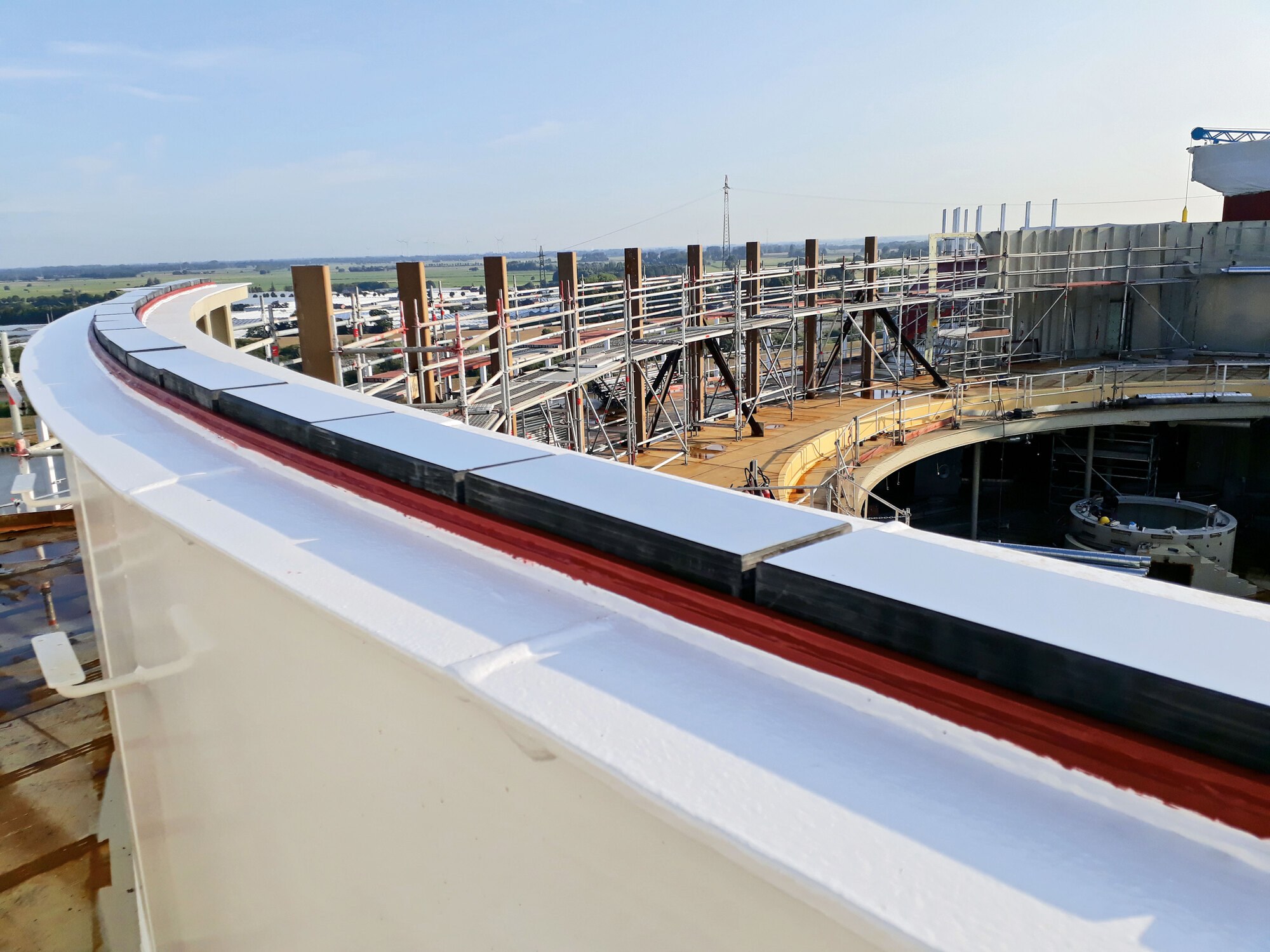 The premium luxury cruiser MS Iona, which is being built in Meyer-Werft shipyard and will be powered by LNG, will be 337 long and have 18 decks with space for 17 restaurants and 5200 passengers. One of the 4 swimming pools is covered with a unique 970 m² glass dome known as the ›SKYDOME‹.Almost friction-free movements within the sliding bearing, even during strong waves and extreme weather, guarantee a roof structure that is free of constraint forces.