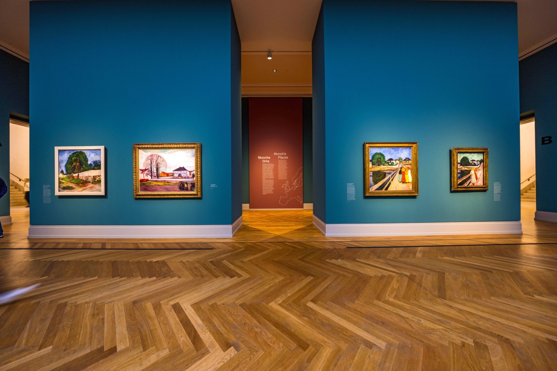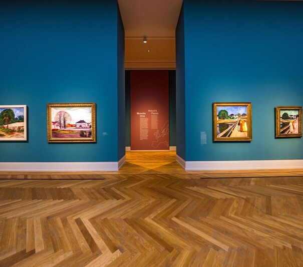 In the interior, the concrete columns were provided with a special substructure for the plaster on account of the entasis. The column rows line up slightly towards the middle. The high-class materials used give the exhibition rooms a suitable ambience.