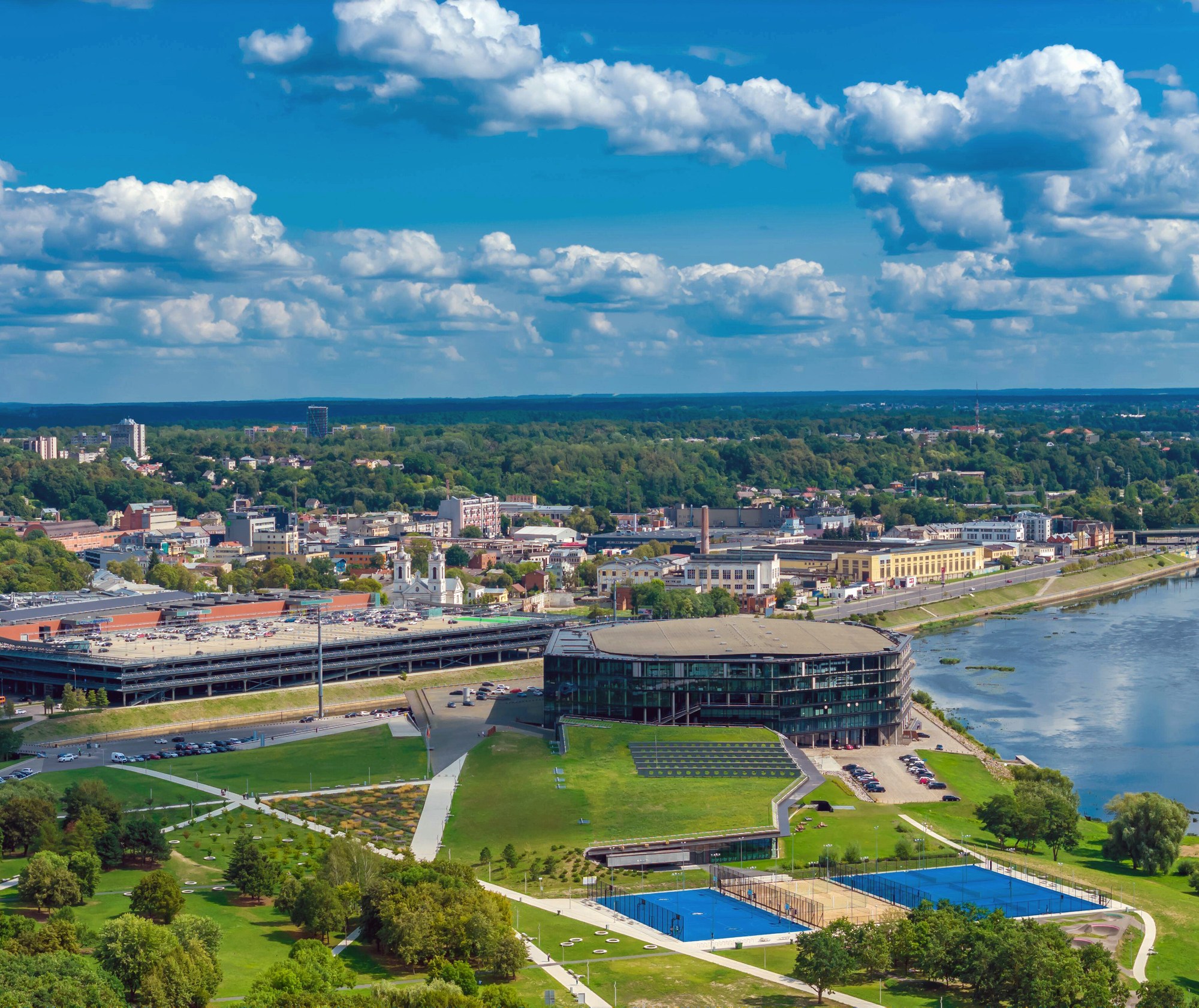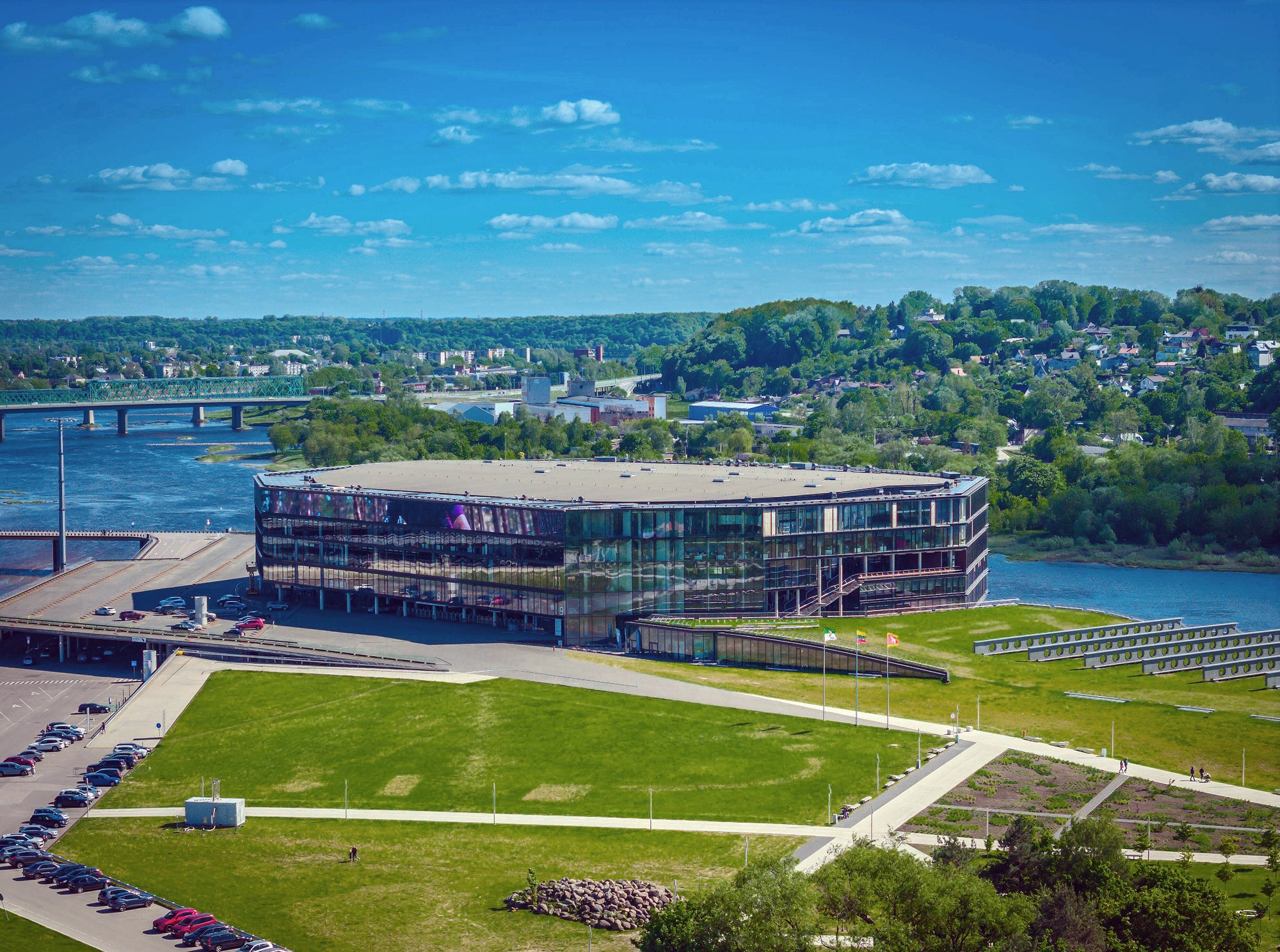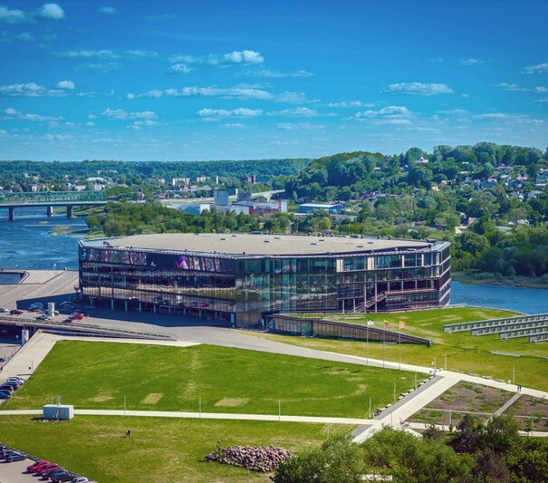 Idyllically situated on an island in the River Nemunas adjacent to the „Žalgiris“ arena, the multifunctional water sports centre is an architectural highlight in the centre of the city of Kaunas. In order to retain the landscape and character of the area, the building structure was executed as a transparent glass/aluminium combination. The interaction of different proportions, shapes, materials and levels underlines its successful visual integration into the surroundings.THE SOLUTION